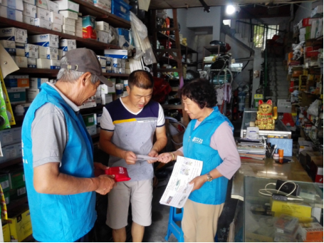 2017年6月26日,27日,翠岭银河社区居民志愿者救援队的队员们不惧酷热,对社区范围所有商铺进行安全走访和宣传,向店主和部分居民发送了安全与急救知识手册和应急安全包。