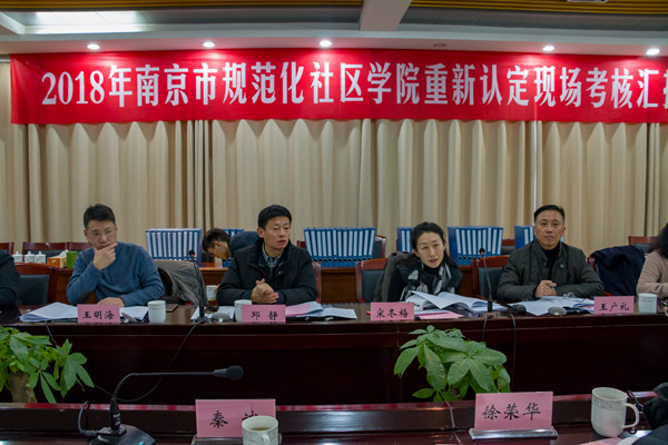 2018年12月13日下午,浦口区社区培训学院接受了“2018年南京市规范化社区学院重新认定”现场考核工作。南京市教育局职社处宋冬梅科长、市终身教育服务指导中心邱静主任等一行6人来到浦口区社区培训学院,对规范化社区学院建设工作进行重新认定。浦口区教育工委书记、区培训学院院长徐荣华、秦斌科长、戎家贵副科长,区社区培训学院尤根地副院长、王永成副校长,街道社区教育中心沈健、付元刚、庆祝、邹香贵、张宁等社区教育干部参加了会议。