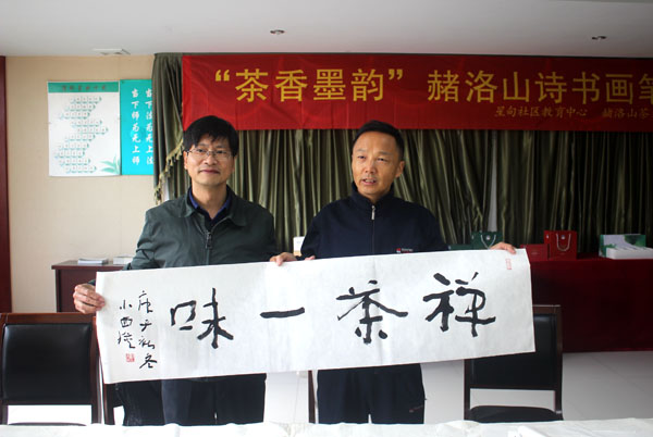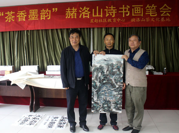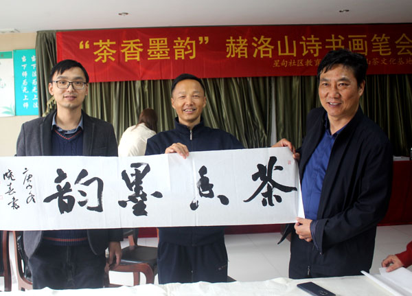 活动一开始,由基地负责人张宴志在山西茶叶基地向书画文人详细介绍了本地茶和茶文化的发展历程及基地的有机茶发展前景。接着,活动组织书画文人登赭洛山,领略赭洛山、驷马河风光,感受本地红色革命文化和乡村田园美景;鸟瞰千亩有机茶园,展望山顶现代滑翔伞基地与茶文化、红色文化相结合的乡村旅游发展前景。最后,在感受了茶文化、本地历史文化和乡村文化之后,社区教育中心组织书画文人在基地会议室进行了书画创作和交流。他们不拘一格、挥毫泼墨,在书画中交流心得,尽献技艺,即兴创作出一批反映茶产业兴旺、生态宜居、乡风文明的优秀书画作品。