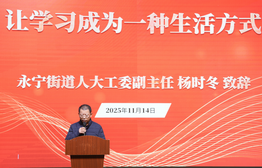 杨时冬在致辞中表示,永宁街道深耕“礼和”文化,以社区教育中心为枢纽,积极构建多元学习服务体系。他呼吁大家以“永续不辍,宁心致远”的热情推动终身学习,让学习成为生活方式,助力大美浦口建设。此次承办全区全民终身学习活动周,既是对街道社区教育成果的集中检验,也是深化“礼和”文化实践、推动学习型社区建设的重要契机。