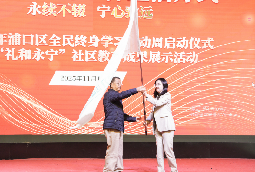 在授旗仪式中,杨时冬将活动承办旗帜交予2026年活动承办方代表、星甸街道党工委组织委员贺小力,预示着浦口终身教育工作将在传承中持续创新、迈向新台阶。