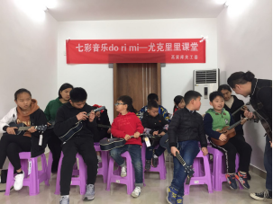 课堂开始,老师为在场的孩子们演奏了一首大家耳熟能详的歌曲。一曲完毕,孩子们已经抑制不住自己的兴奋,纷纷摩拳擦掌跃跃欲试了。他们时而眉头紧锁,时而轻声交谈,完全投入到了学习尤克里里的氛围中。