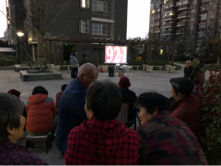 为丰富社区居民的精神生活,尹西社区联合南京市益民社会服务中心携手街道老年体协,于2018年3月23日在晓村社区广场举办放电影活动。本次放电影活动播放的电影是建军大业,在前期的宣传阶段,很多居民就表示想重温一下中国共产党为国奋斗的艰苦历程。活动当天下午,很多居民早早地带着小板凳来到了晓村社区广场等待电影的放映。在电影放映前我们首先播放了《公仆之路》这个纪录片作为暖场视频,该片展现了习近平同志如何从一个乡村知青到中国主席为人民服务的光辉路程。电影《建军大业》描绘的是中国共产党人如何从四一二反革命政变的阵痛中觉醒,通过南昌起义建立自己的军队,最终通过重重阻碍顺利在井冈山会师,看完影片后居民们感慨颇多,现在幸福生活是多么地来之不易,吾辈切勿忘记先辈慷慨之鲜血,激昂之斗志,赴死之决心,珍惜和平美好之新生活。
