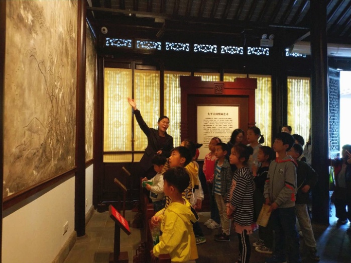 首先,孩子们在讲解员的带领下参观了太平天国壁画艺术馆。讲解员以深入浅出、通俗易懂的方式,生动介绍了中国壁画发展史、太平天国壁画的特点、太平天国其他相关艺术特色等几个方面。在问答互动环节,大家积极参与踊跃回答,不断对壁画艺术形成了初步的认识。