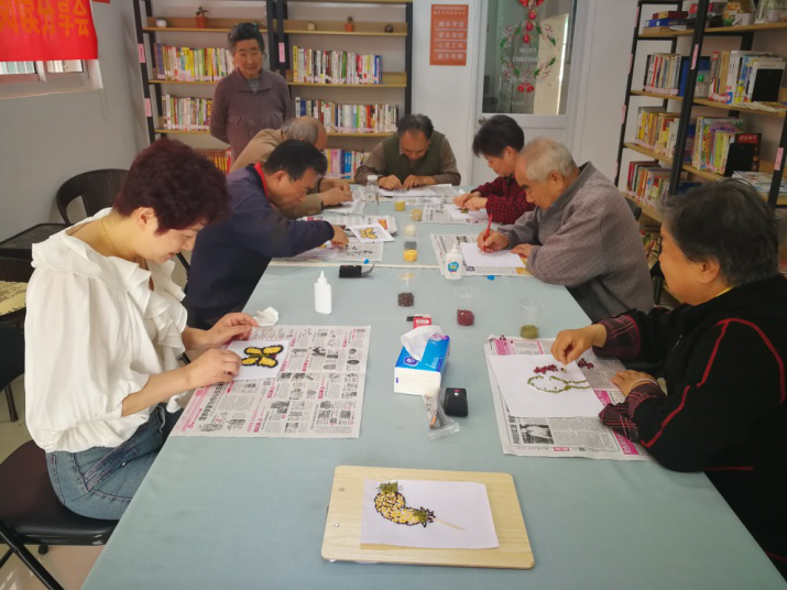 共青团路社区老年朋友们早早来到融乐空间,在工作人员的几句描述和示范下,大家心领神会地开始动手画草图,接着上乳胶,再用一粒粒五谷杂粮填上了色.....经过两个小时的精心制作,一副副创意佳作完成。我们共青团路社区的老年朋友!