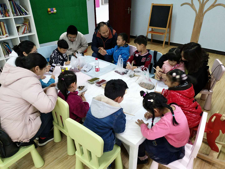 课堂上,老师向孩子介绍说,五谷画是以各类纯天然谷物为原料,利用它们的自然形状和天然色泽,经过粘、贴、拼等方法形成的一种独特的视觉艺术形式。五谷画要先构思好画作内容,然后再把每一粒种子粘出有层次的颜色和形状。老师讲解完之后孩子们就迫不及待地开始创作了,黄豆、红豆、绿豆……在稚嫩的双手之间活络起来,拼凑小小的豆子考验着孩子们的耐心和细心。没过多久,一幅幅初具雏形的作品就展现出来了。
