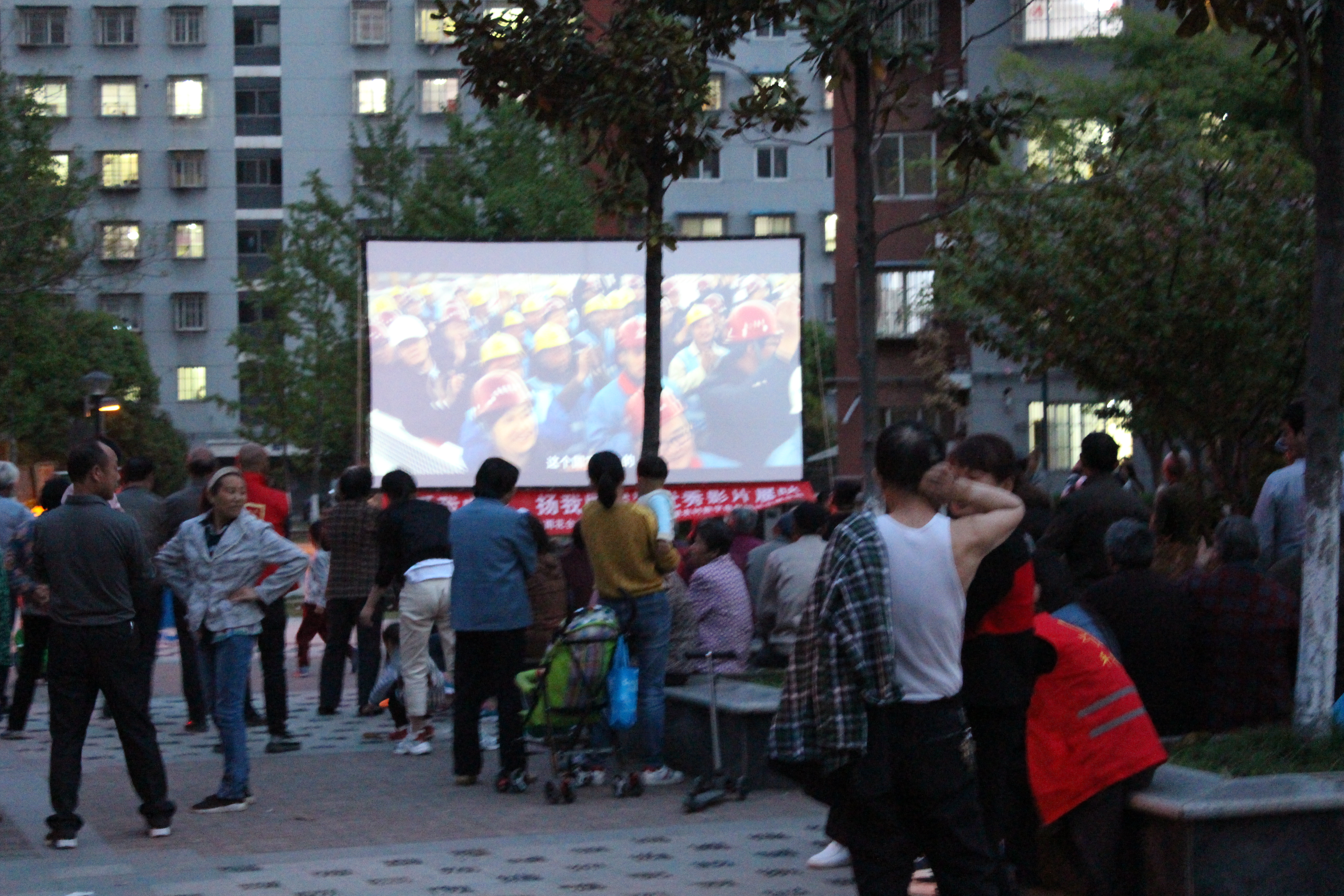 为进一步提升辖区居民的爱国情怀,让红色精神代代传承,由区文化局牵头组织放映的大型纪录片《厉害了我的国》、红色电影《血战湘江》两部影片于4月11日晚7点在三山社区朝阳西苑小区小广场滚动放映。社区紧抓此契机,把此次观影作为党员干部“两学一做”的学习教育活动,社区党总支率班子成员、部分党员、社区工作人员一行10人参与观影,辖区居民近300多人围坐广场、集中观看。