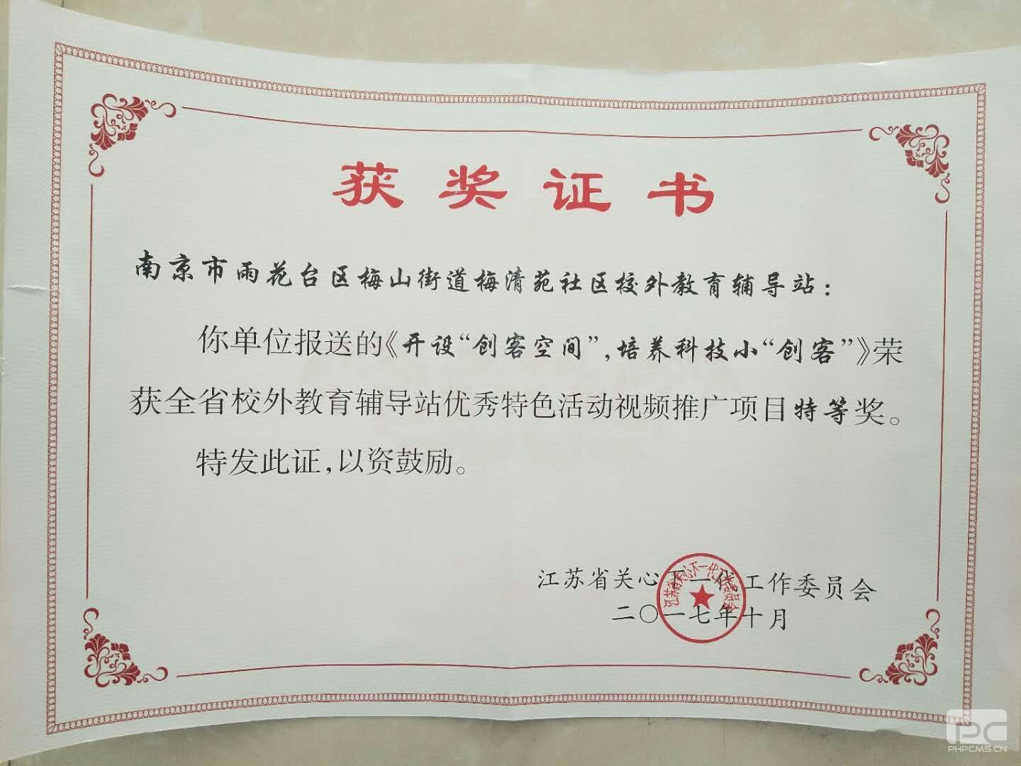 在雨花台区关工委2018年工作会议上,区关工委领导向梅清苑社区校外教育辅导站颁发了省关工委授予的获奖证书。梅清苑社区校外教育辅导站报送的《开设“创客空间”,培养科技小“创客”》荣获全省校外教育辅导站优秀特色活动视频推广项目特等奖。梅清苑社区校外教育辅导站将会在现有工作基础上继续努力,力争青少年校外教育工作更上一层楼。
