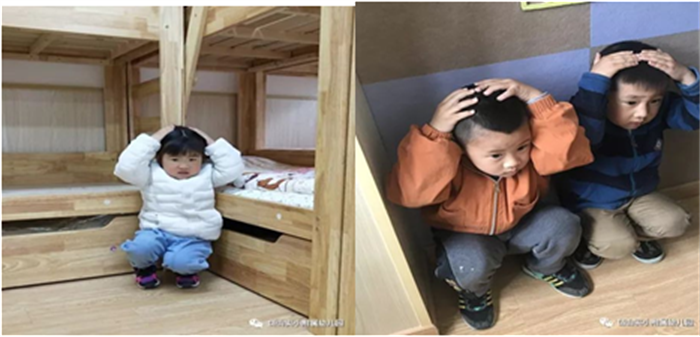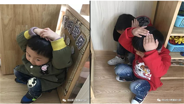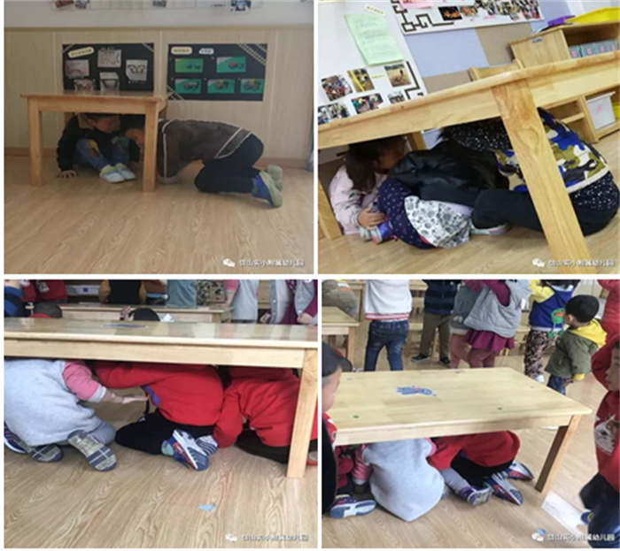 随着“地震警报”声的响起,防震疏散演练正式开始!听到在第一遍地震预警后,各班教师沉着冷静地指挥孩子们双手护头,躲在结实的桌子下、安全的三角区等地紧急避险。