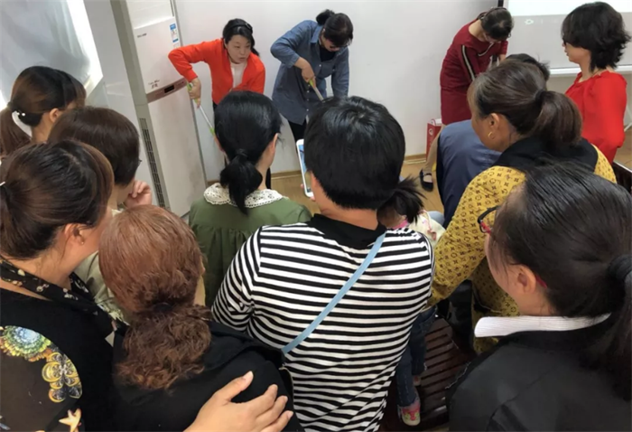 不少居民是带着这样的疑问参加培训:家政不就是拖拖地,洗洗碗,抹抹桌子吗?还需要培训?培训老师一开始说起了拖地的手法,不少居民非常感兴趣,一下子围了上去,看老师进行示范,并用工具实操起来。纷纷表示:果真有“手法”,这样比原来在家做好像是干净了不少。